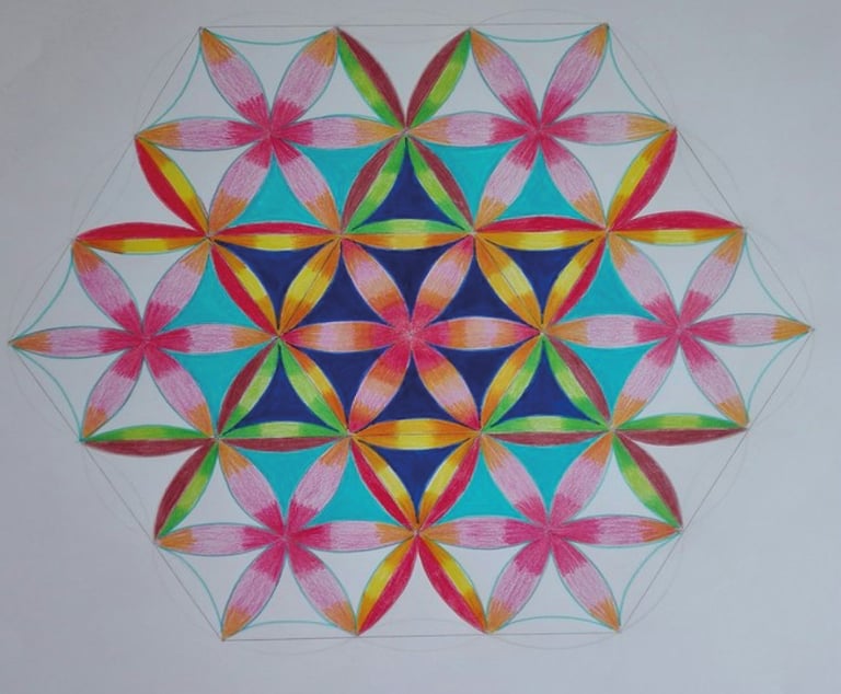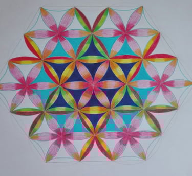 "Découverte du mandala lors d'un atelier collectif sur la graine de vie. Explications quant aux origines, le pourquoi, le comment faire et surtout des conseils pour son propre mandala. Moi assez bavarde, je n'ai pas dit mot lors de ma création, laissant aller mon imagination et mes émotions. Un vrai moment de plénitude où j'ai lâché le mental." Nadège