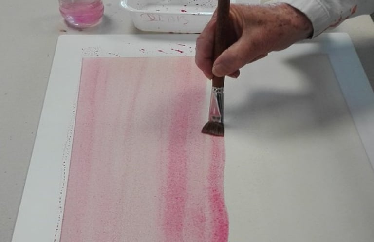 Voilà exactement ce qu'apporte l'aquarelle sur papier mouillé. Faite de pigments et de gomme arabique de qualité, elle s'utilise sur une feuille humectée qui adhère à une plaque. Vous êtes en lien avec votre gestuelle et votre respiration.