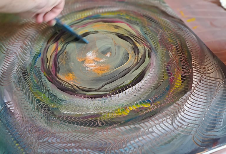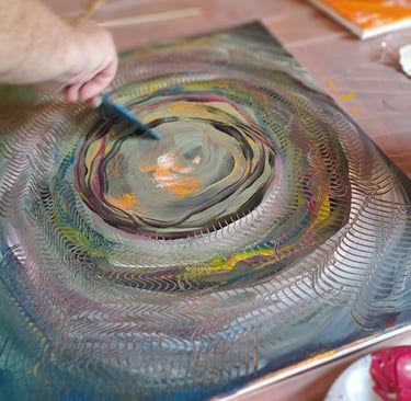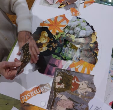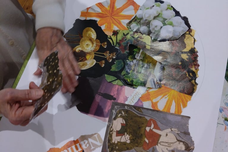 Je vous accompagne avec des médiums artistiques (les outils) pour vous aider à exprimer ce qui ne peut l'être par les mots. (aquarelle sur papier mouillé, collage, dessin de forme, modelage, mandala, peinture et + encore).