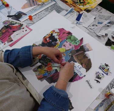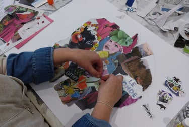 Je colle, je rassemble, je me déconnecte. Se dire avec des mots, se révéler par des images et dans des couleurs. Je vis une expérience extraordinaire, explosive et joyeuse. Merci à Patricia pour son accompagnement et pour toutes les bonnes ondes produites" Marie