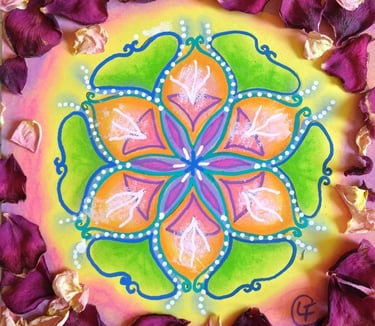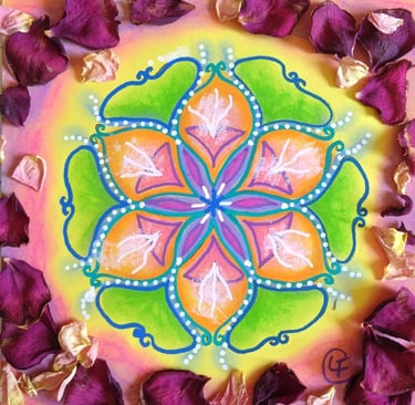 "Découverte du mandala lors d'un atelier collectif sur la graine de vie. Explications quant aux origines, le pourquoi, le comment faire et surtout des conseils pour son propre mandala. Moi assez bavarde, je n'ai pas dit mot lors de ma création, laissant aller mon imagination et mes émotions. Un vrai moment de plénitude où j'ai lâché le mental." Nadège
